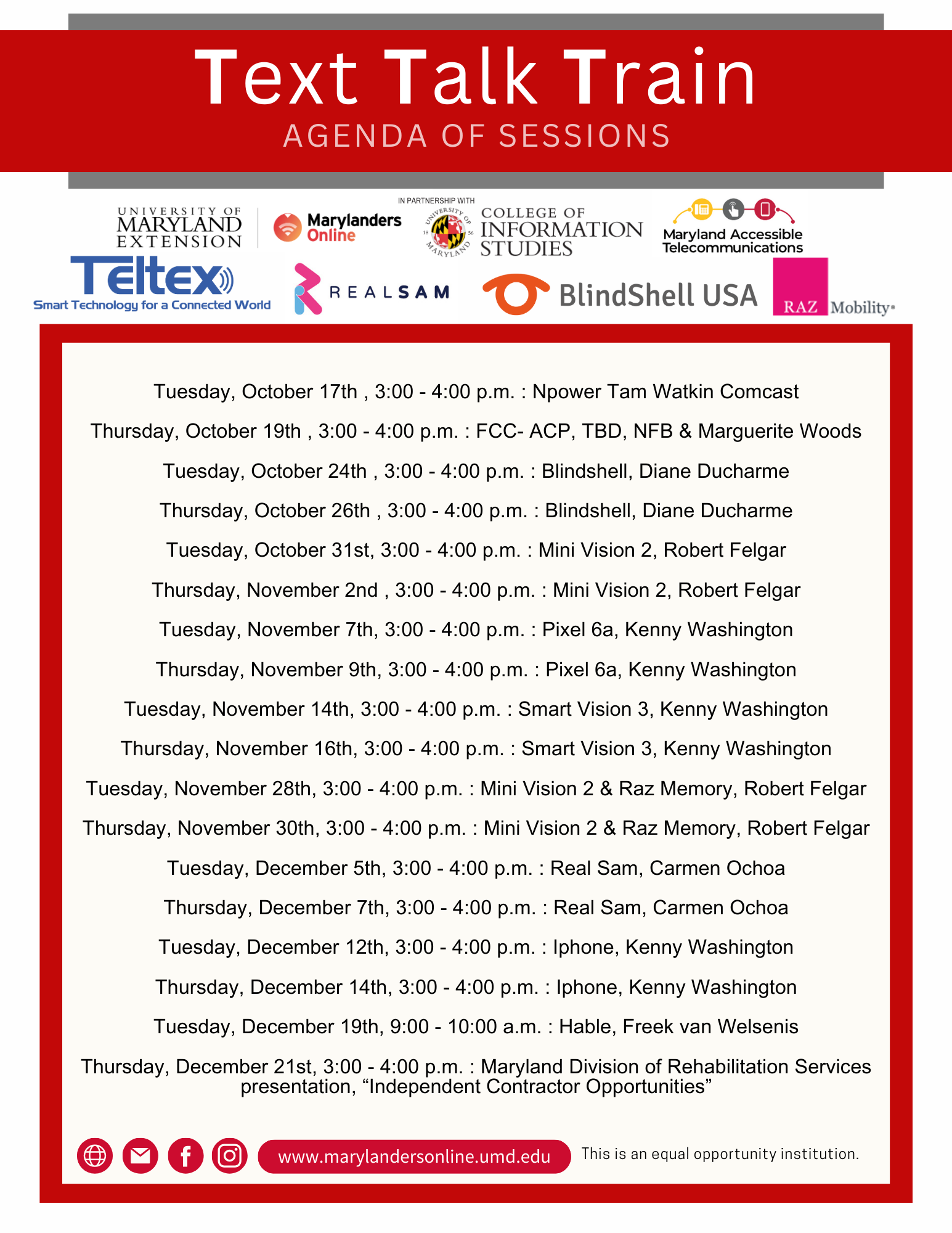 Playing a big part in this project was Marylanders Online, a University of Maryland Extension (UME) initiative in partnership with the College of Information (INFO), which works to bring digital equity to Marylanders by providing digital literacy and inclusion resources. TTT coordination support was provided by Maryland Accessible Telecommunications, a program administered by Telecommunications Access of Maryland with the Maryland Department of Disabilities which provides assistive telecommunications equipment to qualified applicants who have difficulty using a standard telephone. Together, MAT and UME developed the training program, bringing in live CART captioners and American Sign Language (ASL) interpreters to each virtual session to ensure they were accessible to all participants. These videos and their corresponding transcripts were then uploaded to YouTube for later reference by participants.