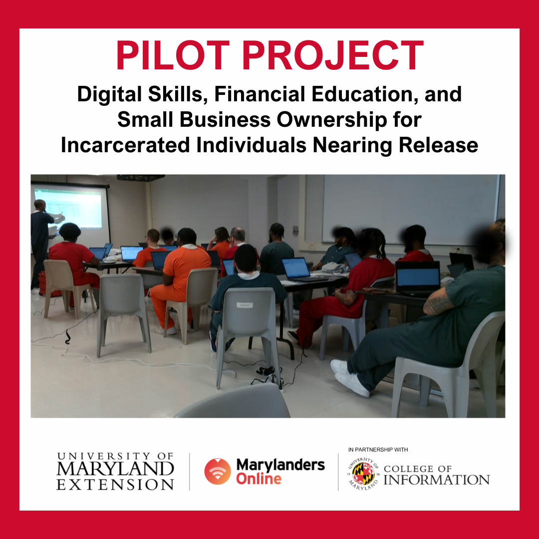 A pilot project funded by UME Marylanders Online achieved remarkable success at a Maryland prison. Twenty-one incarcerated individuals nearing release completed a six-week “Digital Skills Financial Education and Small Business Ownership” course, learning business and economic concepts to prepare them for future employment opportunities. The program was taught by Extension Agent Michael Elonge, who will be posthumously awarded the Digital Equity Champion Impact Award at the 2025 Maryland Digital Opportunity Summit.